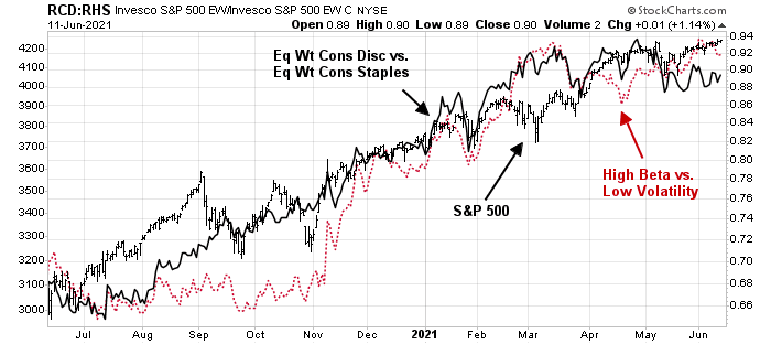 Equity risk appetite, as measured by the equal-weighted performance of consumer discretionary to staples, is exhibiting a strong negative divergence. The ratio of high-beta to low-volatility stocks is showing a minor negative divergence.