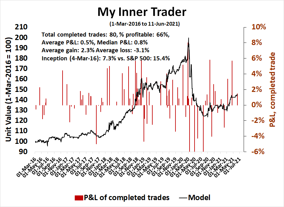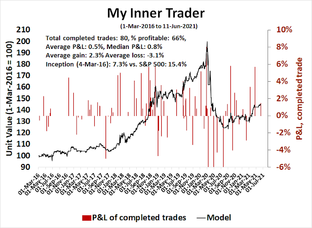My inner trader uses a trading model, which is a blend of price momentum (is the Trend Model becoming more bullish, or bearish?) and overbought/oversold extremes (don’t buy if the trend is overbought, and vice versa). Subscribers receive real-time alerts of model changes, and a hypothetical trading record of the email alerts is updated weekly here. The hypothetical trading record of the trading model of the real-time alerts that began in March 2016 is shown below.