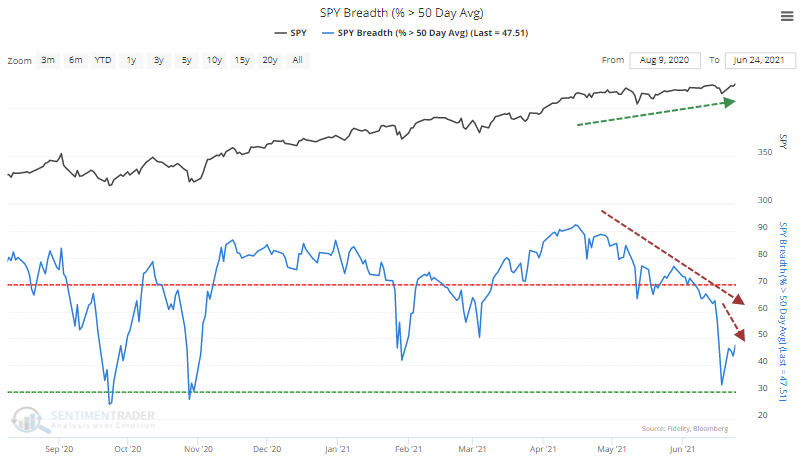 Mid-week market update: I’ve had a number of questions from readers about the warnings of imminent market declines from SentimenTrader. In this post, Jason Goepfert’s headline was “This Led to Declines Every Time in the Past 93 Years”. He highlighted the market’s poor breadth, as measured by the percentage of stocks above their 50 dma.