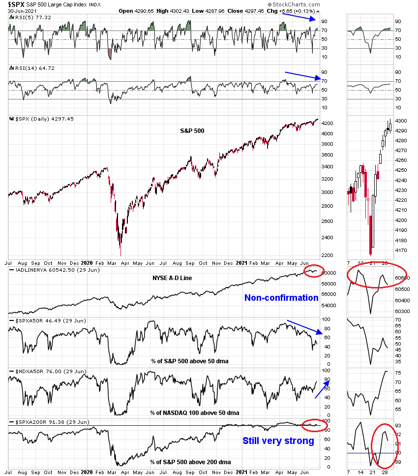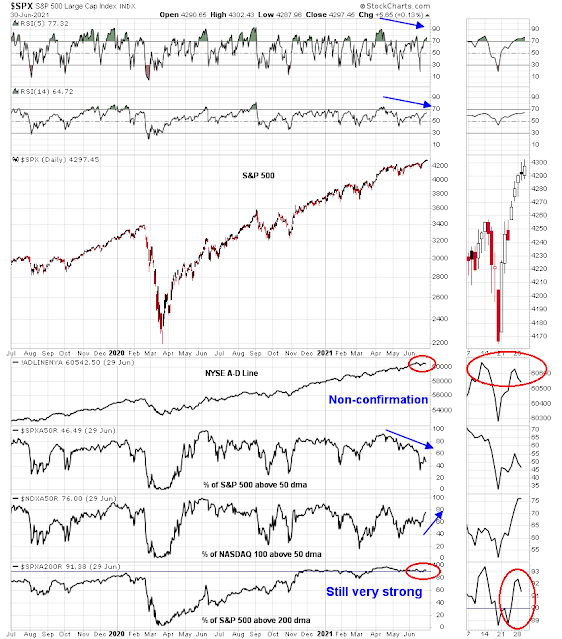 Another supportive element for the strength of the S&P 500 comes from a more nuanced interpretation of breadth readings. Sure, the NYSE A-D Line has not confirmed the index’s recent highs, the market is exhibiting negative RSI divergences, and the percentage of S&P 500 stocks above their 50 dma look terrible. On the other hand, the percentage of NASDAQ stocks above their 50 dma is showing signs of life, which is an indication of the internal growth and value rotation, and the percentage of S&P 500 stocks above their 200 dma is still above 90%.