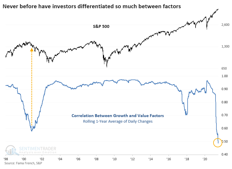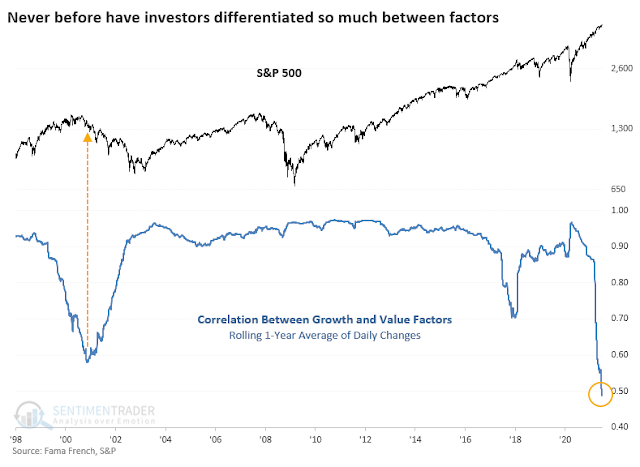 separate article, “The Correlation Between Growth and Value Has Never Been Lower`. Even though he interpreted the data in a bearish way, his observation is consistent with my past analysis that this is a highly bifurcated market that’s divided between growth and value stocks.