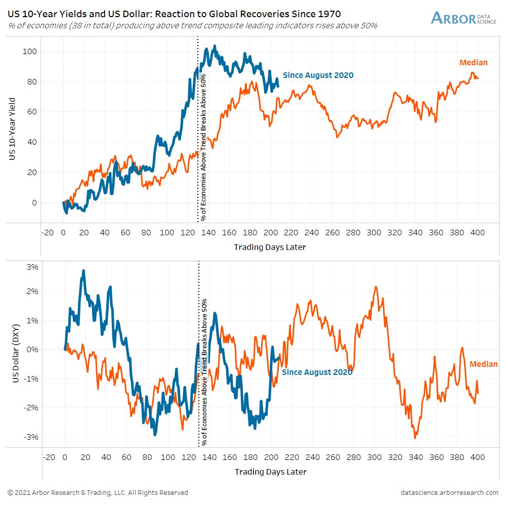 From a global macro perspective, the key indicators to watch are the 10-year Treasury yield and the USD. If they move together, it will be an important clue as to the direction of the global economy. So far, they are behaving in a fashion consistent with past global recoveries. Yields have rebounded but progress has stalled, and the USD is volatile but range-bound.