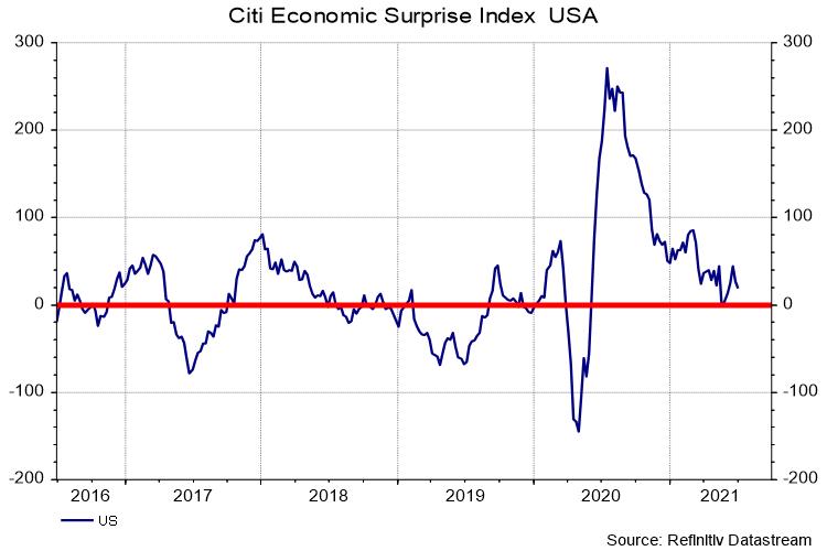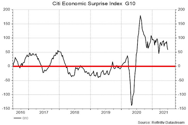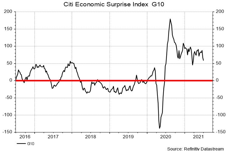 From a momentum perspective, the G10 Economic Surprise Index, which measures whether economic releases are beating or missing expectations, is decelerating after a V-shaped recovery. However, ESI readings are still positive, indicating there are more positive than negative surprises.