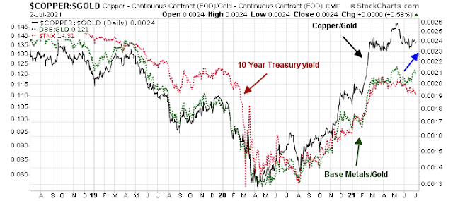 Also, keep a close eye on commodity prices and the cyclically sensitive copper/gold and base metal/gold ratios. The copper/gold ratio is consolidating sideways while the more diversified base metals/gold ratio is starting to exhibit a more bullish pattern. Should these two ratios strengthen further, it will be an important signal of global economic strength and put upward pressure on bond yields, steepen the yield curve, and be bullish for the value stocks over growth.