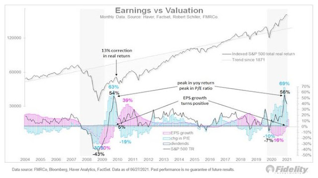 Jurrien Timmer of Fidelity Investments had a different viewpoint. He characterizes a mid-cycle expansion as a period where the driver of equity returns is earnings gains rather than P/E multiple expansion: ” The market is transitioning from its valuation-driven early-cycle phase to an earnings-driven mid-cycle phase, so while it remains in an uptrend—with higher highs & higher lows—there hasn’t been much progress since April, a normal part of this adjustment.”