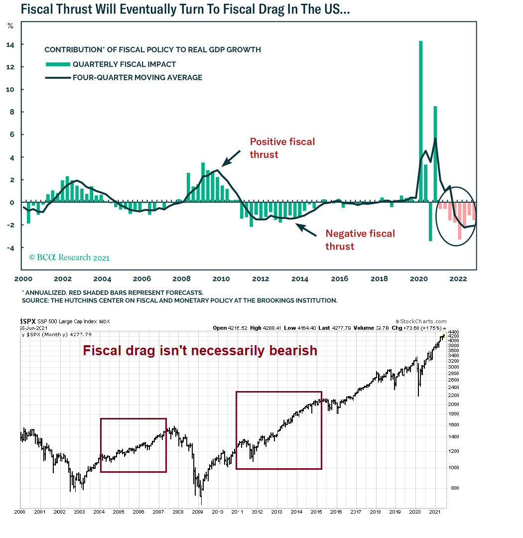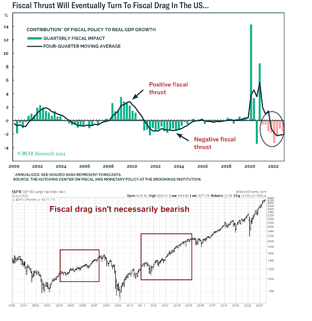Just as it’s time to start withdrawing monetary accommodation, expect fiscal support to also diminish over the coming quarters. The Hutchins Center on Fiscal and Monetary Policy forecasts that the recent record of fiscal thrust will turn into fiscal drag. Similarly, the historical evidence on fiscal drag episodes has not been equity bearish either.