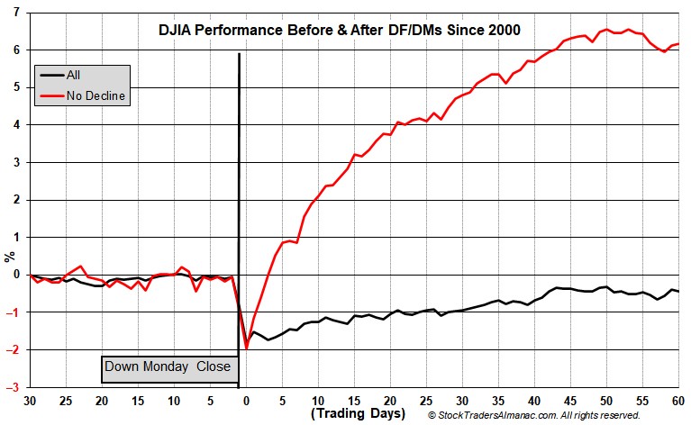 Since January 1, 2000 through todays close there have been 221 DJIA Down Friday/Down Mondays (DF/DM) including todays. From DJIA’s closing high within the next 7 calendar days to its closing low in the following 90 calendar days, DJIA has declined 212 times with an average loss of 7.21%. Declines following the DF/DM were greater in bear market years and milder in bull market years (see page 76 of Stock Trader’s Almanac 2021). The eight times when DJIA did not decline within 90 calendar days after were following DF/DMs on October 7, 2002; May 19, 2003; November 17, 2003; February 3, 2014; October 13, 2014; October 31, 2016; September 25, 2017 and October 9, 2017.