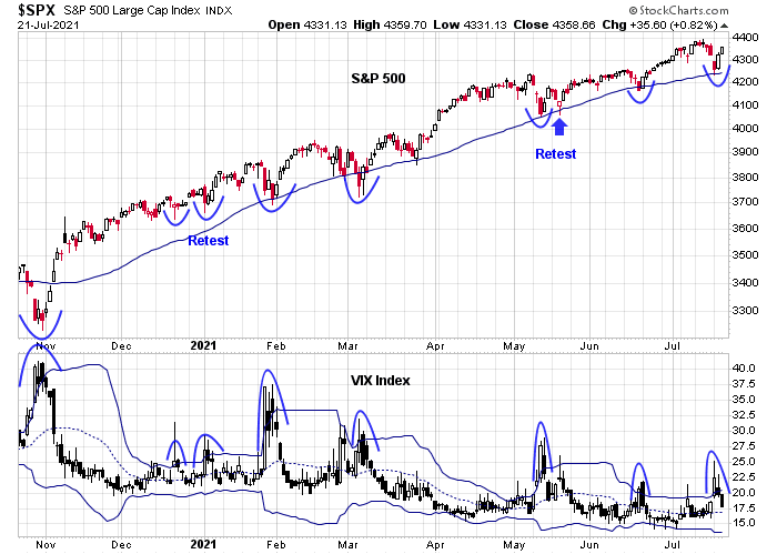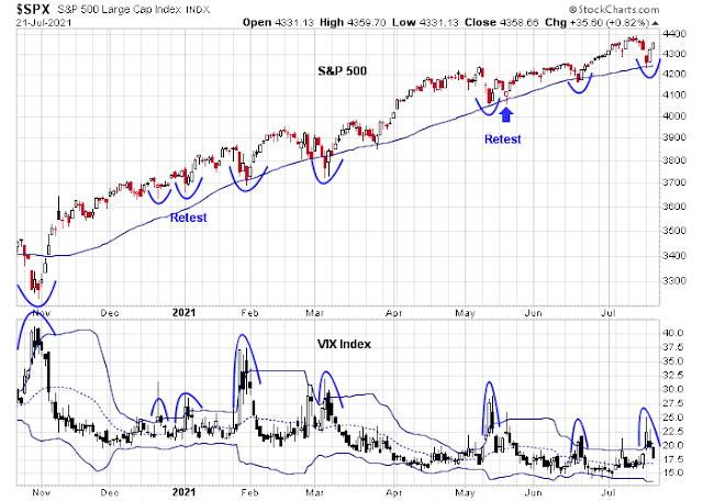 The VIX Index rose above its upper Bollinger Band on Monday, which is the signal of an oversold market, and recycled below its upper BB. The S&P 500 duly rallied as a result. However, this condition does not preclude a retest or even an undercut of Monday’s lows. If the past is any guide, any market weakness will begin after the VIX touches its 20 dma.&