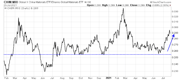 As well, the relative returns of Chinese material stocks to global materials are strong, which is an implicit signal of cyclical strength from China. Commodity strength is surprising in light of the news that China plans to sell 170,000 tonnes of non-ferrous metals in another round of auctions, according to state media Xinhua.