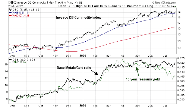 There is one silver lining in the Chinese dark cloud. The commodity markets are holding up well, which is constructive for the global economic outlook as China is the largest consumer of many raw material inputs. Commodity prices are holding above their 50 and 200 dma, and the cyclically sensitive base metals to gold ratio has been trading sideways despite the bearish signals from the 10-year Treasury yield.