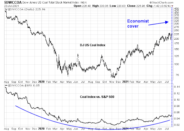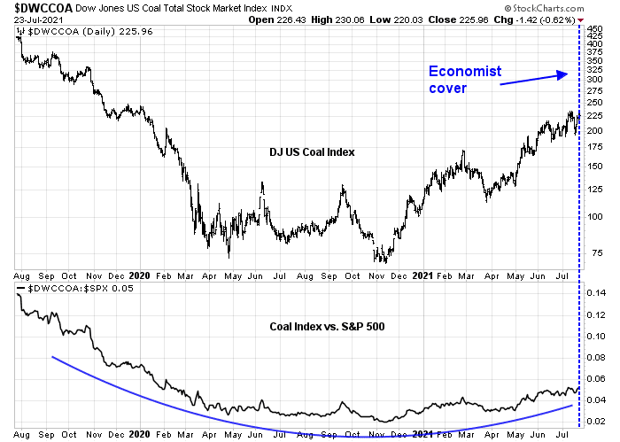 One of the worse culprits of carbon emissions is coal. Coal stocks represent a relatively small part of the market, but here is how this industry has behaved in the last two years. The stocks made a saucer bottom and it is breaking upward, both on an absolute basis and relative to the S&P 500.