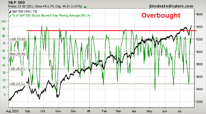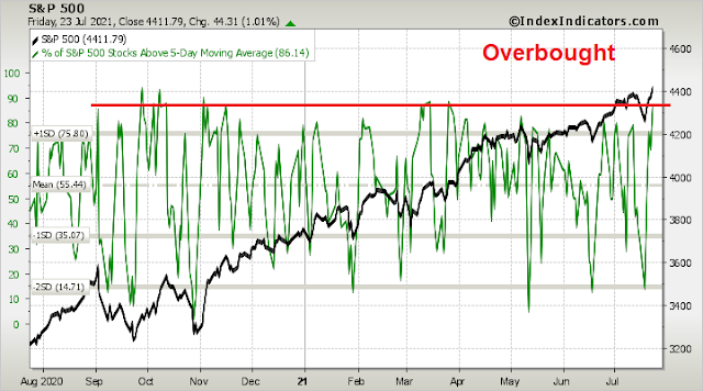 In the very short-term, breadth is extremely overbought. Even if you are bullish, expect a pause or pullback early in the week.