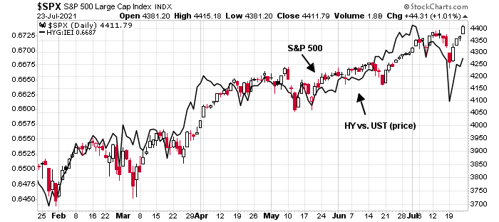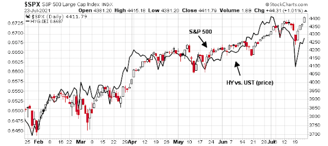 As well, credit market risk appetite is not behaving well. The relative price performance of junk bonds to their duration-equivalent Treasuries is exhibiting a minor negative divergence, which is another concern.