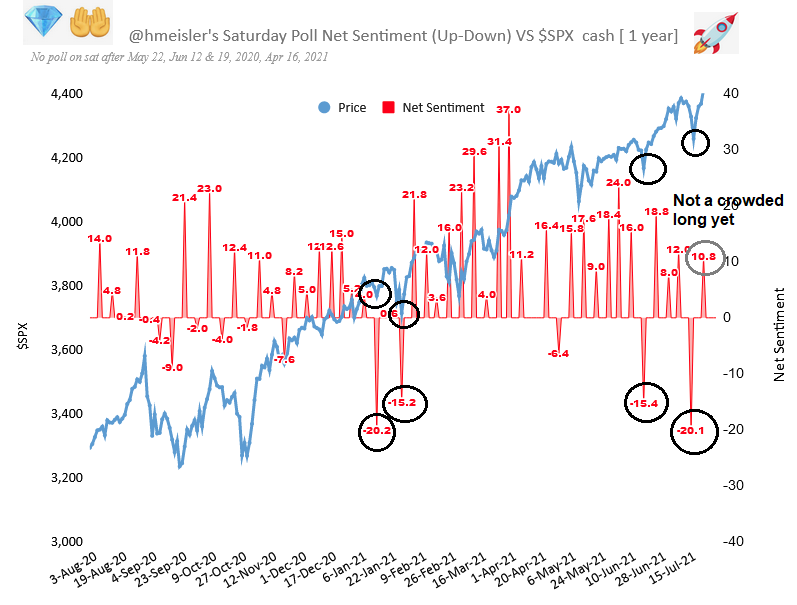 Helene Meisler conducts a weekend (unscientific) Twitter poll. Sentiment had plunged to negative double-digits the previous week, and such readings had marked tradable bottoms in the past. The latest week’s sentiment survey saw a bullish snapback, but conditions are not at a crowded long, which gives the bulls the run to run.