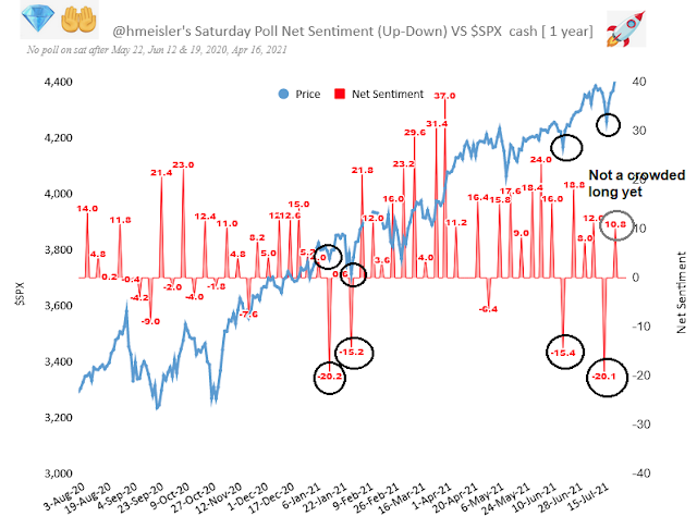 I want to give a shoutout to Home Construction. D.R. Horton in their analyst call report a big profit beat but said disruptions (lumber and other materials and supply chains) would have the voluntarily constraining home building. The stock dropped 4% at the opening the next day. Then there were a few Buy upgrades and the stock flew up dramatically along with the ITB Home Construction ETF flying up. People are first shocked and then looking beyond current short-term disruptions of Value oriented economically sensitive companies. This is why the general index could have a big leg up here.
