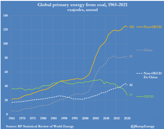 A more detailed analysis of global coal usage shows that OECD countries began to wean themselves off coal as an energy source at the time of the GFC. Chinese coal usage took off in the early 2000s and plateaued about 2014, while other EM coal demand continued to rise. The latest G-20 meeting ended without an agreement on the phaseout of coal powered electrical generation based on objections from China, India, and Russia.