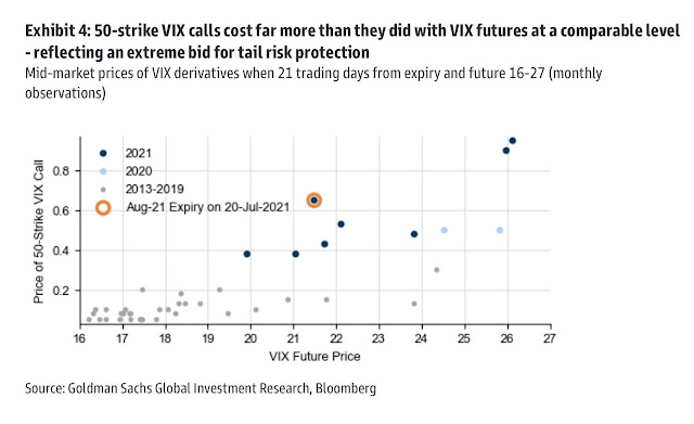 As well, option sentiment derived tail-risks are rising, as evidenced by the pricing of August VIX call options. I attribute this to the pricing of event risk based on what might occur at the Fed’s Jackson Hole gathering. As the market is pricing in sizable QE taper style announcements from Jackson Hole, this puts a floor on any taper trantrum risk-off episodes in the coming weeks.