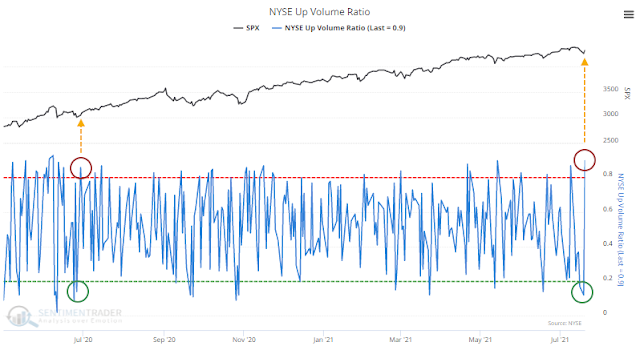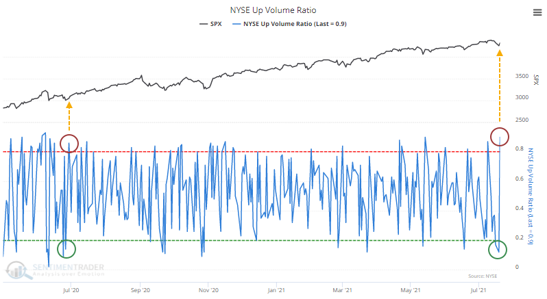 SentimenTrader pointed out that the “Up Volume Ratio cycled from below 15% to above 85% in back-to-back sessions on the NYSE”, which is “a buy signal that has never failed”.