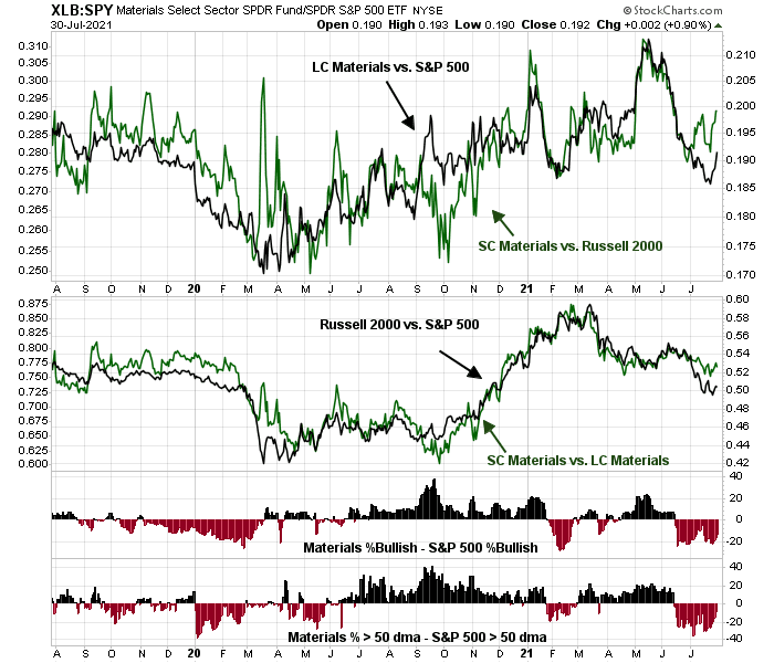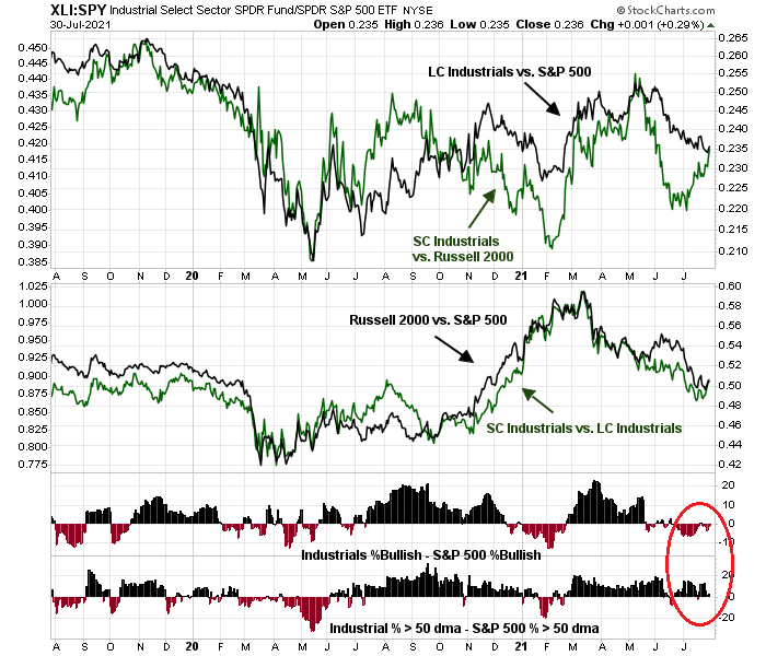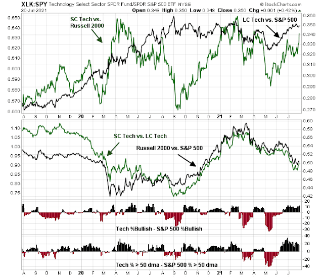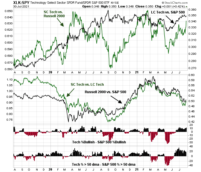 Based on this analysis, we can see that the technology sector has been improving steadily in relative performance in both large and small-cap since mid-May, as shown by the top panel and the bottom two breadth charts. However, there is no discernible difference in market cap effect as the relative performance of small-cap technology to large-cap technology has tracked the relative performance of the Russell 2000 to S&P 500.