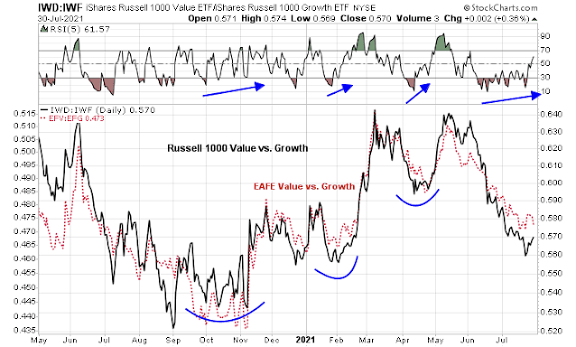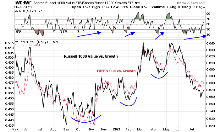 Cyclical and value sectors have been lagging growth stocks, but both the value/growth ratio is exhibiting a series of positive RSI divergences. Don’t count the cyclicals out just yet.