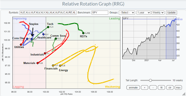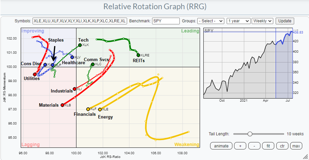The latest RRG chart shows growth sectors (technology, communication services) and selected defensive sectors (consumer staples, healthcare, REITs) in the top half of the chart, indicating leadership positions. Value and cyclical sectors are the laggards in the bottom half.