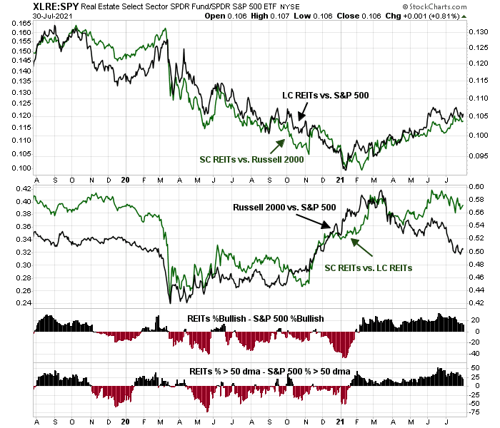 The REIT sector is another defensive sector exhibiting relative strength. Both large and small-cap REITs made a relative bottom in January, which was earlier than healthcare. Small-cap REITs are showing better leadership than their large-cap counterparts.