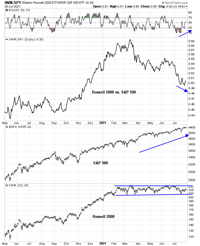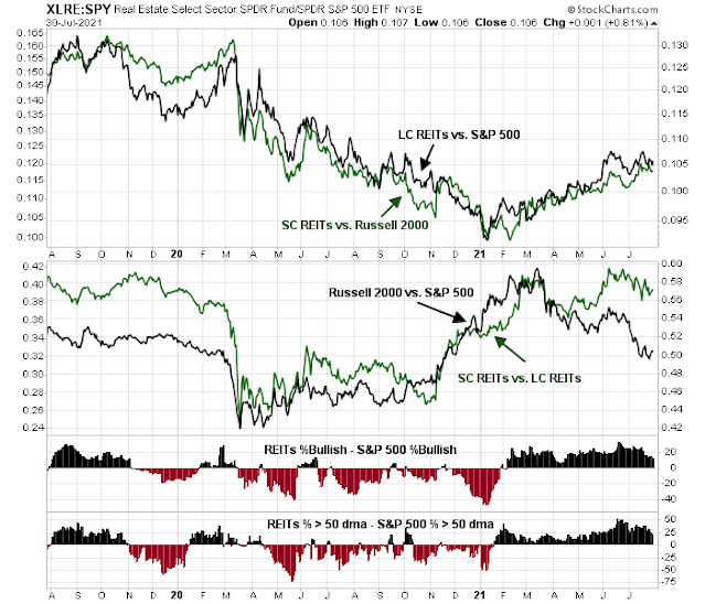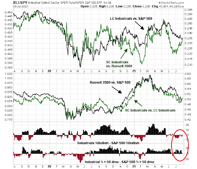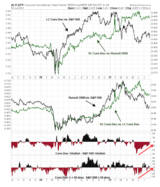 The float-weighted consumer discretionary sector is dominated by the presence of Amazon and Tesla, which gives the sector a growth tilt, and its relative performance (top panel, black line) is flat to down in 2021. However, the equal-weighted and small-cap consumer discretionary sector is more cyclically oriented. and they are performing better than their float-weighted growth counterparts. In addition, relative breadth indicators are showing early signs of a turnaround.