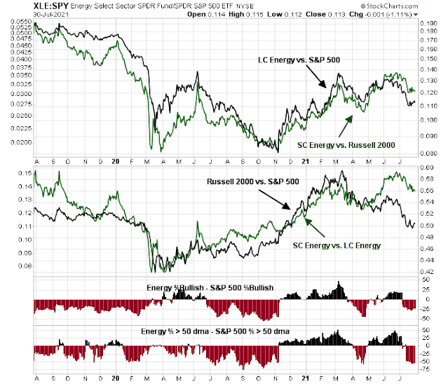 Energy stocks are also weak, but they may be trying to put in a relative bottom. The relative returns of small to large-cap energy (middle panel, green line) is performing better than the Russell 2000, which is a possible hopeful sign for value and energy bulls.