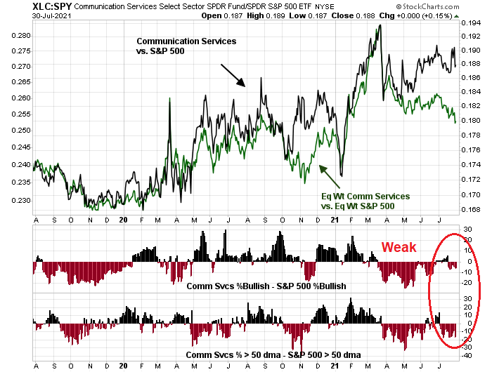 The communication services sector has no small-cap stocks. I use the relative returns of the equal-weighted sector to the equal-weighted S&P 500 as a substitute (green line). Despite the recent strength of growth stocks, the market internals of communication services is disappointing. Both the equal-weighted relative returns and breadth indicators show a picture of relative weakness.