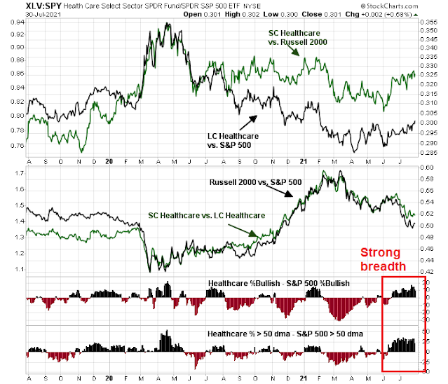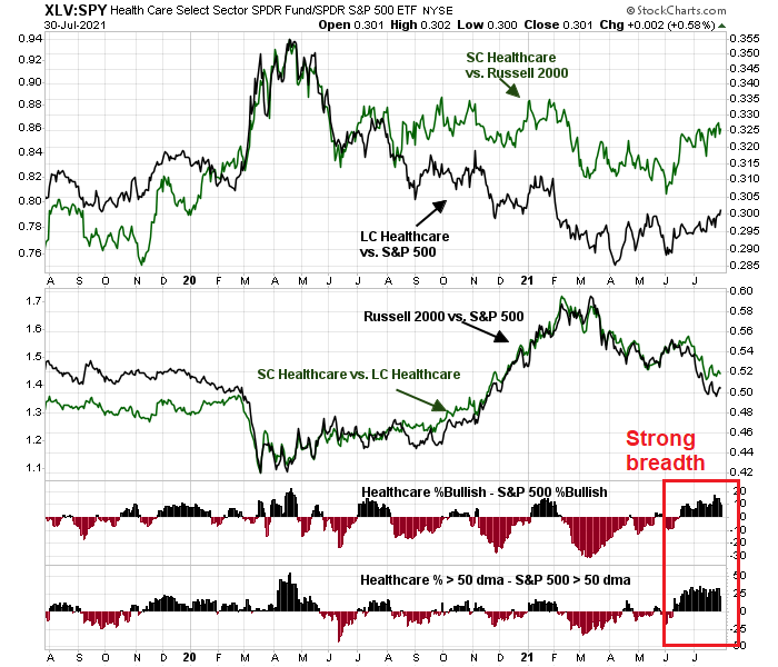 Even as the S&P 500 advanced to fresh all-time highs, the defensive sectors have been showing a surprising level of relative strength. The largest defensive sector by weight is healthcare. Both large and small-cap healthcare made relative strength bottoms during the April/May period, though the improvement was evident earlier based on the breadth indicators. However, the relative performance of small-cap to large-cap healthcare has tracked the size factor, indicating no relative leadership in small-cap healthcare.