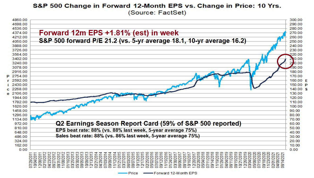 In addition, the US value/growth ratio is highly correlated to the EAFE value/growth ratio. As the US markets have more growth characteristics, the renewal of US equity leadership can be explained partially by a revival in growth stocks. How long can growth dominance continue? The latest update from Q2 earnings season shows an astounding EPS beat rate of 88% and forward EPS estimates are rising strongly. Keep in mind that my estimate of a 1.81% positive revision in forward EPS means that, unless the S&P 500 were to rise 1.81%, forward P/E would decline. Such a display of earnings beats and positive revisions should create tailwinds for cyclical and value stocks.