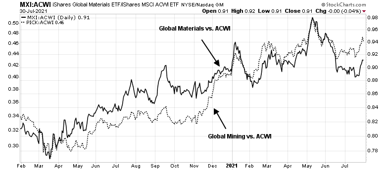 While the relative performance of US materials are weak, the relative performance of global materials and mining stocks is showing some signs of life.