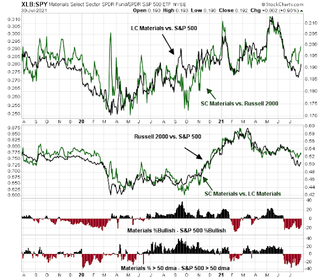 Finally, the relative performance of material stocks is highly volatile, but both large and small caps have been tanking since early June.