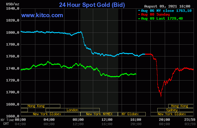 The roof caved in last Friday. The strong July Jobs Report steepened the yield curve, pushed down real yields, and strengthened the USD. Gold prices gapped down to test an important support level (dotted line). It crashed through support today.
