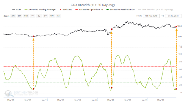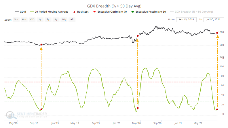Over the past 20 days, an average of fewer than 12% of gold miners were trading above their 50-day moving average, which is now starting to curl higher.