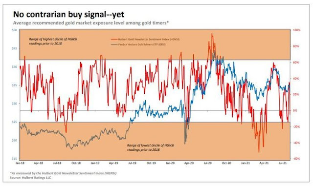 The sudden downdraft took me and a lot of other analysts by surprise. Gold prices had everything going for it. On August 8, 2021 Jason Goepfert of SentimenTrader wrote the following constructive comment on gold miners: