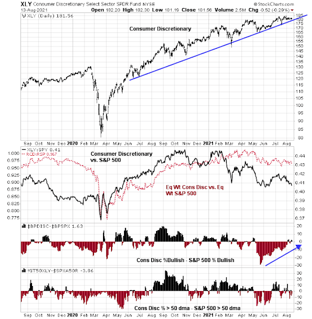 Consumer discretionary stocks are a mix of growth and value. The largest weights in the sector are Amazon and Tesla, which have growth characteristics, while the rest of the sector is more reflation and cyclically sensitive. The sector has been on a well-defined uptrend owing to the strength of its growth components. However, the relative performance of the equal-weighted consumer discretionary sector (red dotted line) has been moving sideways. Relative breadth has shown signs of improvement, indicating underlying strength of reflation and cyclical factors.