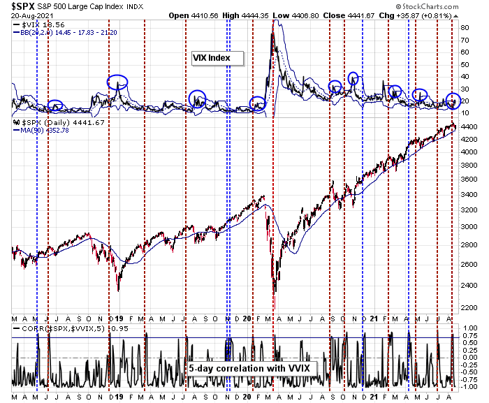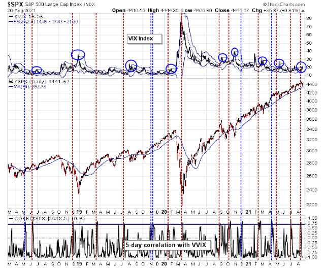 A week ago, I highlighted the risk of stock market weakness because the correlation between the S&P 500 and VVIX, or the volatility of the VIX, had spiked. The pullback duly arrived and the S&P 500 briefly tested its 50 dma.