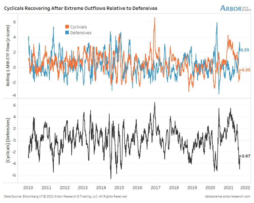 Ben Breitholtz at Arbor Capital recently observed, “The gap between cyclical vs defensive ETF flows rebounding from an extreme. Cyclical IG credits tend to outperform after these extremes.”