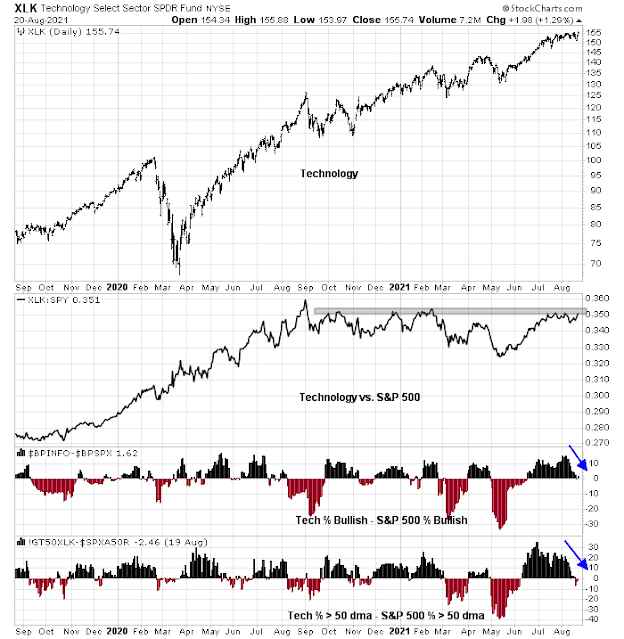 By contrast, the technology sector, which is the largest growth stock sector in the S&P 500, is testing both absolute and market relative resistance levels while relative breadth internals deteriorate.