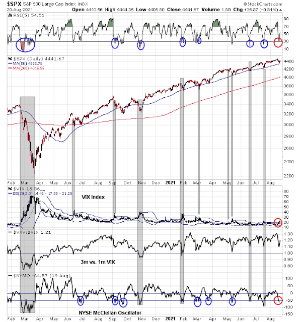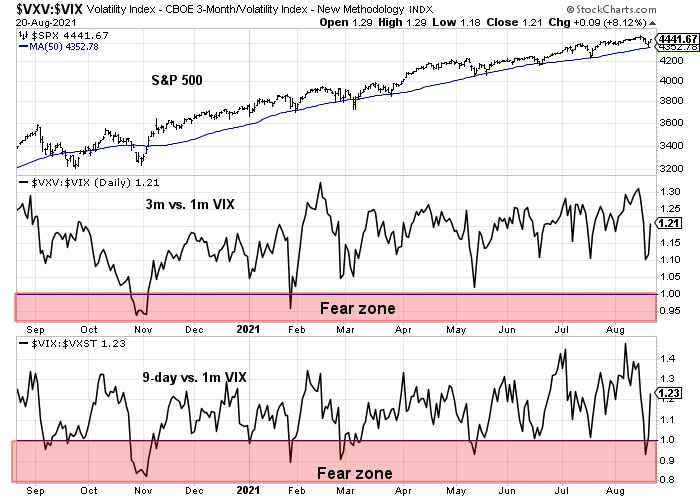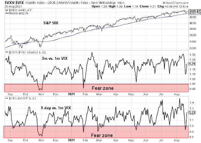 The only exception is the term structure of the VIX, which did not invert to indicate panic. To be sure, while my main indicator of the 1-month to 3-month VIX futures did not invert, the 9-day to 1-month VIX briefly did.