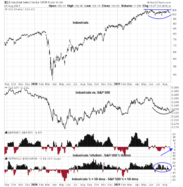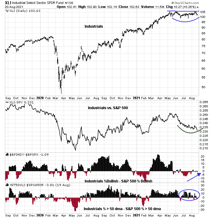Industrials stocks is another cyclical sector exhibiting a similar pattern of saucer-shaped absolute and relative bottoms and strong relative breadth internals.