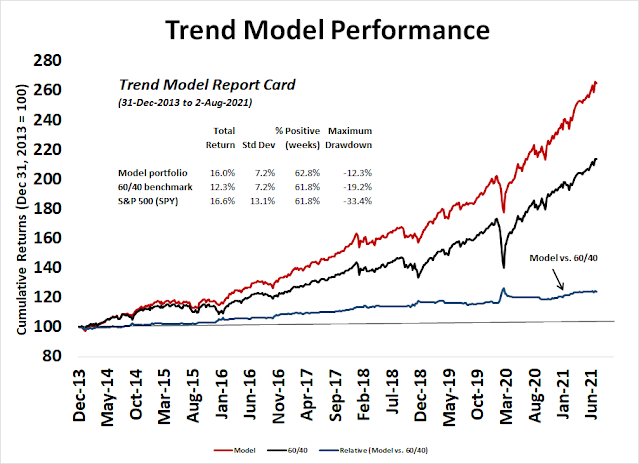 Trend Asset Allocation Model is an asset allocation model that applies trend following principles based on the inputs of global stock and commodity price. This model has a shorter time horizon and tends to turn over about 4-6 times a year. The performance and full details of a model portfolio based on the out-of-sample signals of the Trend Model can be found