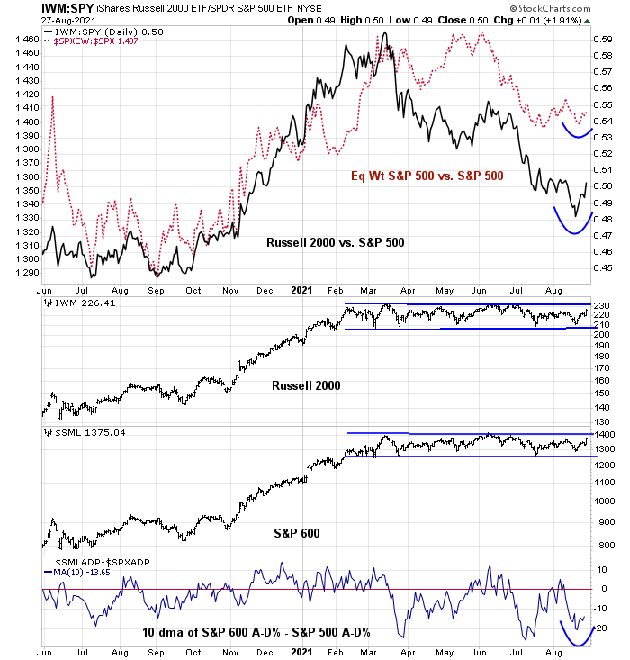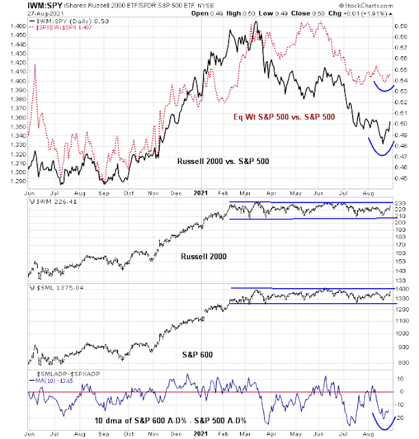 In particular, I am monitoring for signs of risk appetite. As an example, the high-beta small cap indices remain range-bound, but their relative performance is improving. As well, internal breadth (bottom panel) is showing a turnaround. I interpret these as constructive signs for the bull case.