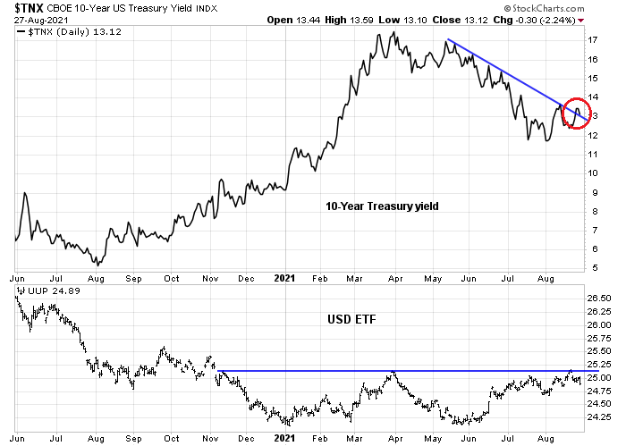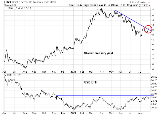 The 10-year Treasury yield is testing its falling trend line, which is bullish for the cyclical and reflation case. However, the USD Index is testing resistance and an upside breakout would be bearish for cyclicals. Which way will the market turn?