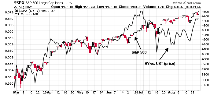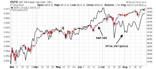 Credit market risk appetite, as measured by the relative price performance of junk bonds against their duration-equivalent Treasury counterparts, is also turning up.