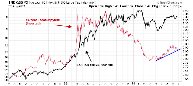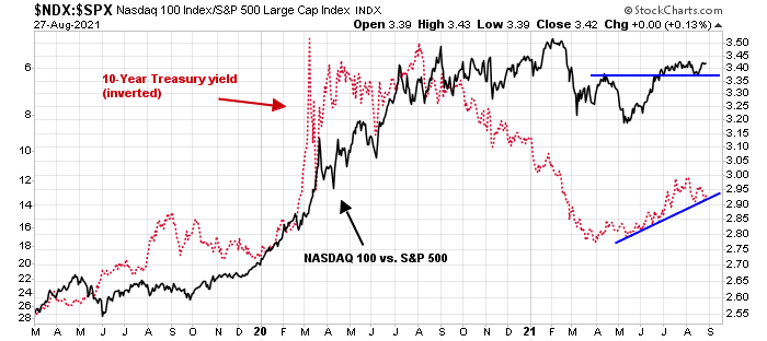 Much of the value and growth relationship depend on bond yields. The relative performance of the growth-heavy NASDAQ 100 has been correlated to the 10-year Treasury yield.