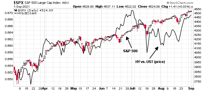 Similarly, credit risk appetite, as measured by the relative price performance of junk bonds to their duration-equivalent Treasury counterparts, have also been steadily rising.