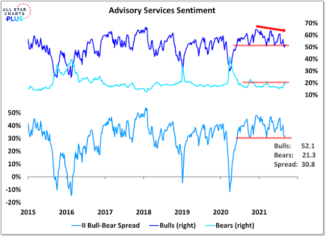 Sentiment readings are likely to put a floor on stock prices should they pull back. The latest Investors Sentiment Survey shows a decline in bullish sentiment and a rise in bearish sentiment. The bull-bear spread is consistent with past trading bottoms, not tops.