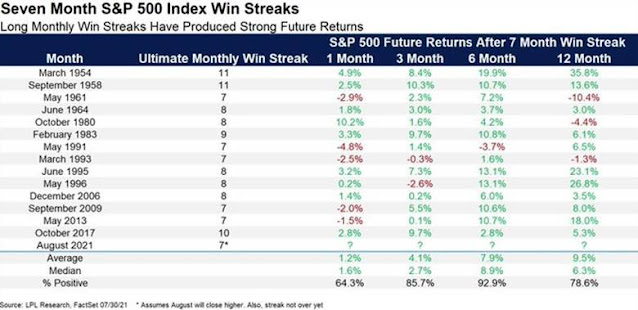 Ryan Detrick is another market historian with a different take. The S&P 500 has risen for seven consecutive months. Such episodes have resolved with strong positive returns over a six-month time horizon 13 out of 14 times.